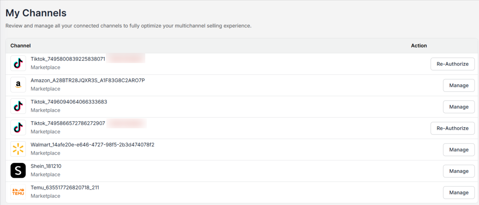 The My Channels section gives you complete control over all your connected sales channels. Whether you're expanding to TikTok Shop/Walmart/SHEIN/Temu or managing your existing Amazon stores, this is where you review connections and fine-tune settings to optimize your multichannel selling experience fully.