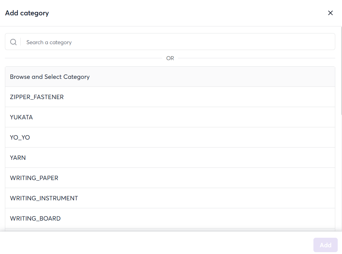 - In the popup or selection menu, search for and select the product category you want to add.