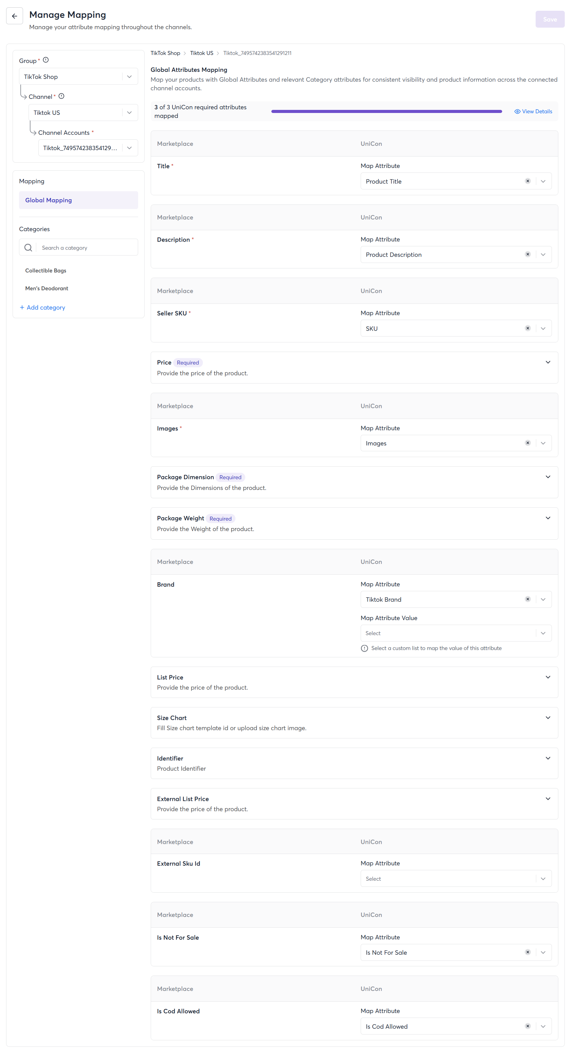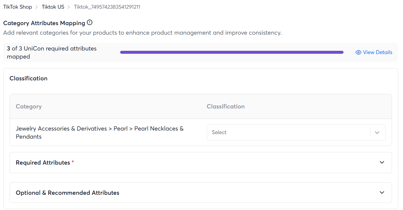 - Next, make sure to map all the UniCon required, TikTok Shop required, and optional attributes for your category