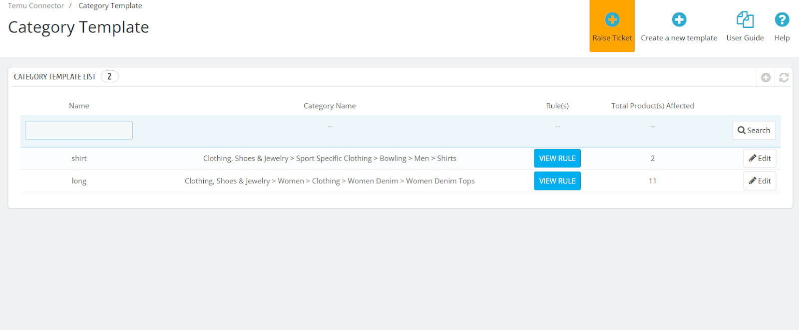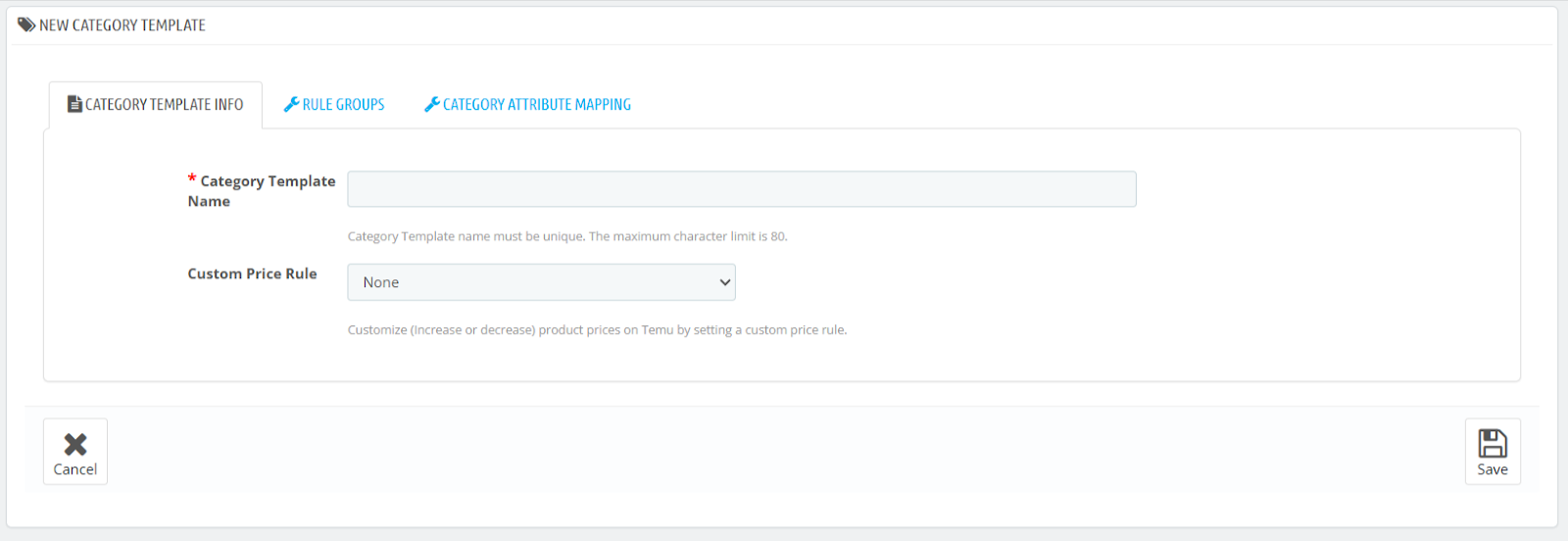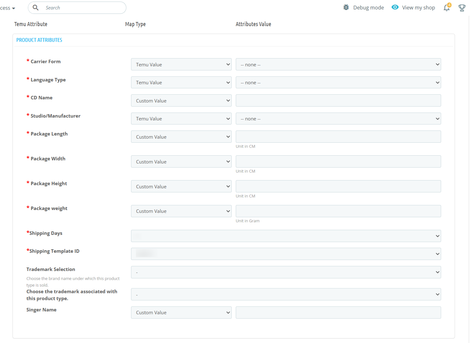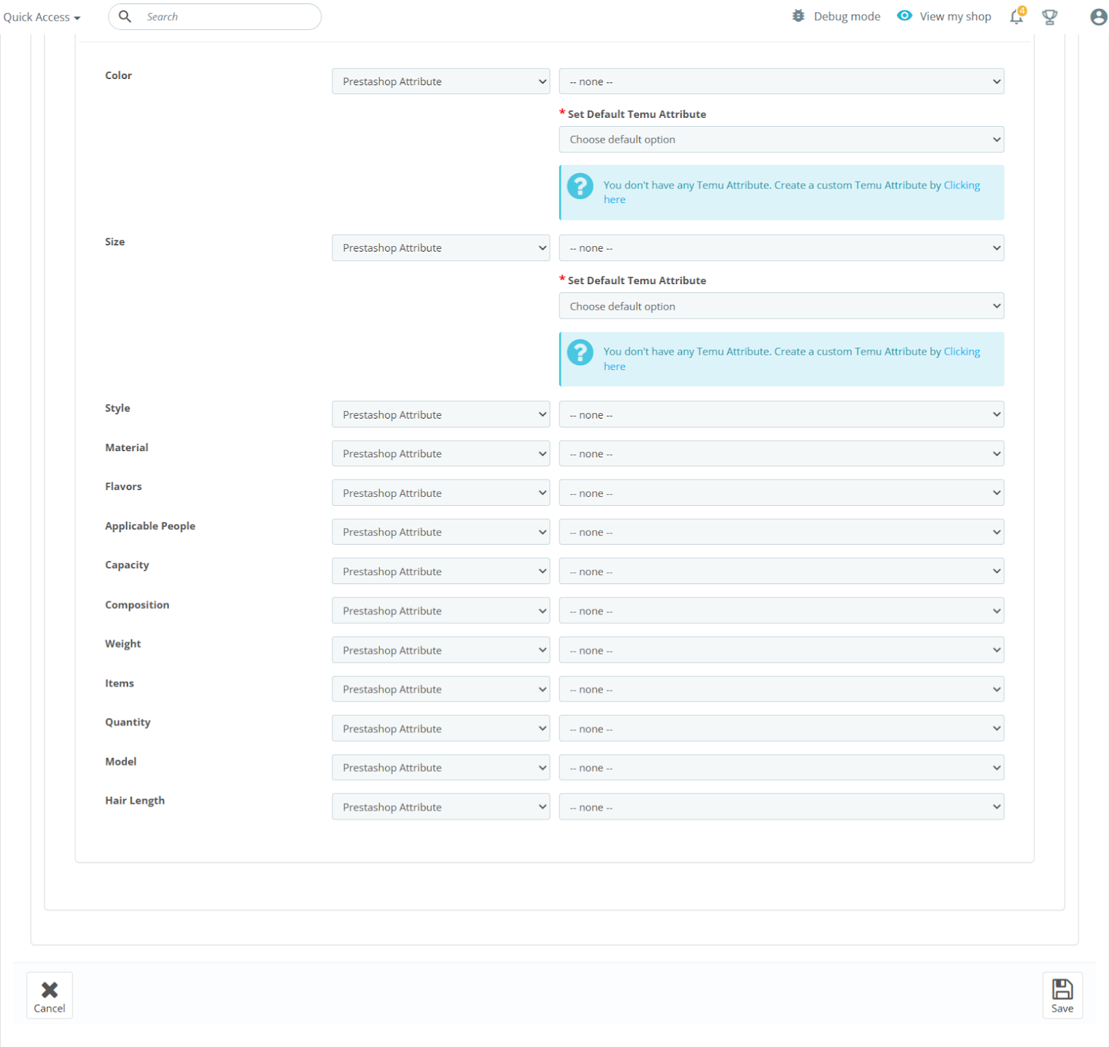 Temu Attribute – This field allows you to map the selected PrestaShop attribute to a corresponding Temu attribute.