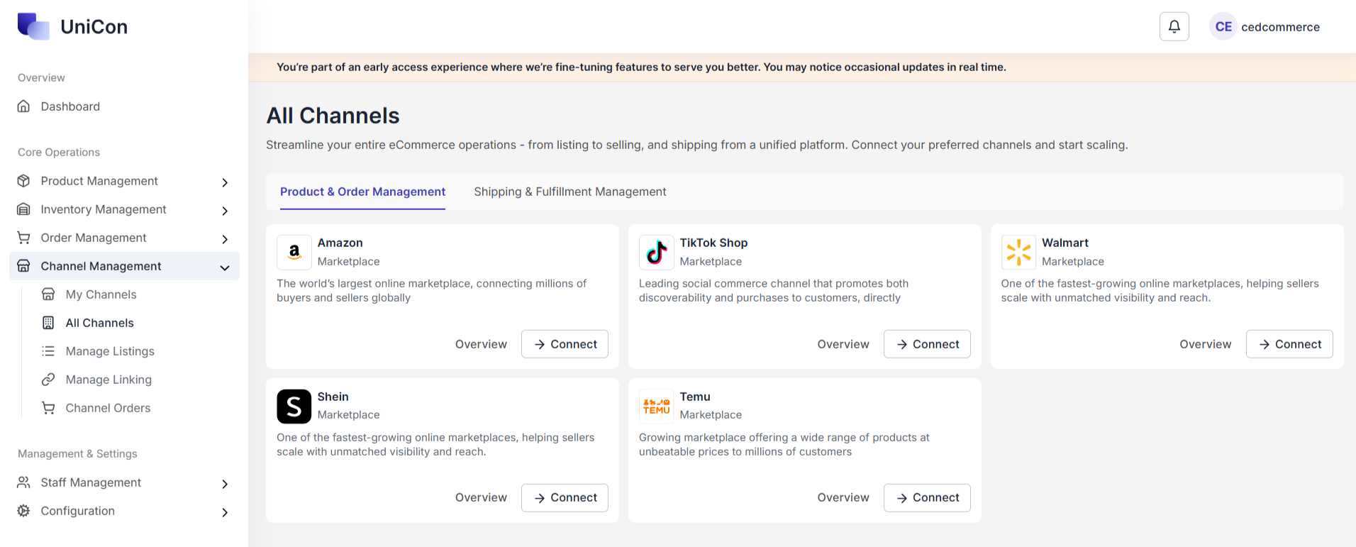With All Channels, UniCon makes it easy to manage every part of your multichannel operation—from listing to delivery. Whether you're adding TikTok Shop to your existing Amazon setup or integrating shipping tools like ShipStation, this section ensures you stay connected, synced, and ready to scale.