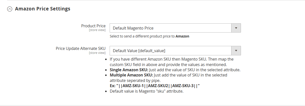 - Inventory Update Alternate SKU: Choose the SKU attribute for syncing inventory to Amazon.