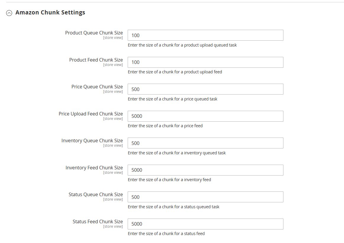 These settings define the chunk size for batch processing of product, price, inventory, and status feeds to Amazon. Large feeds are split into smaller chunks to ensure smooth sync.