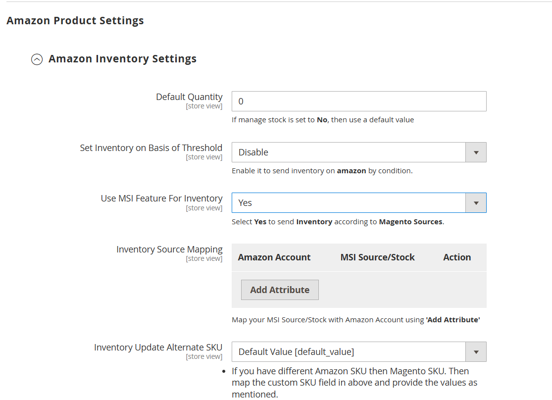 - Tip: Use Add Attribute to create a new mapping between Amazon inventory and a Magento MSI source.