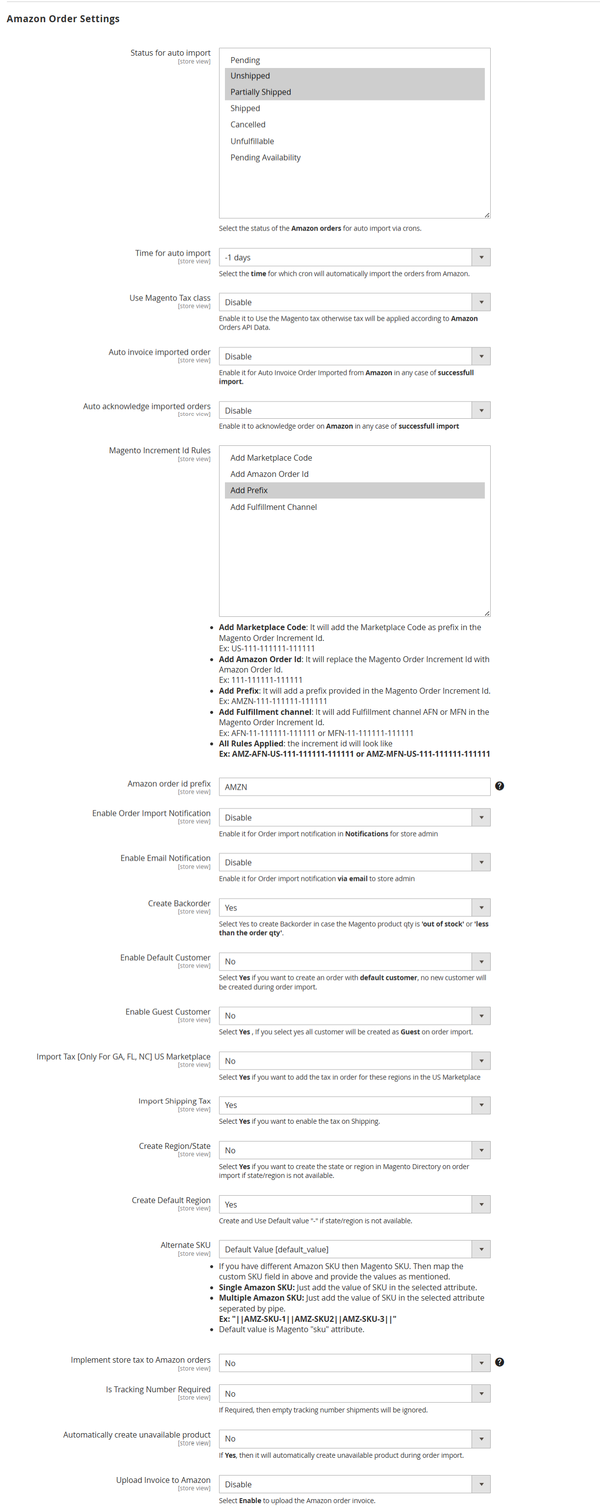 This section outlines the process for importing and handling orders from Amazon within Magento. You can set rules for order status mapping, invoice generation, and default store assignment.