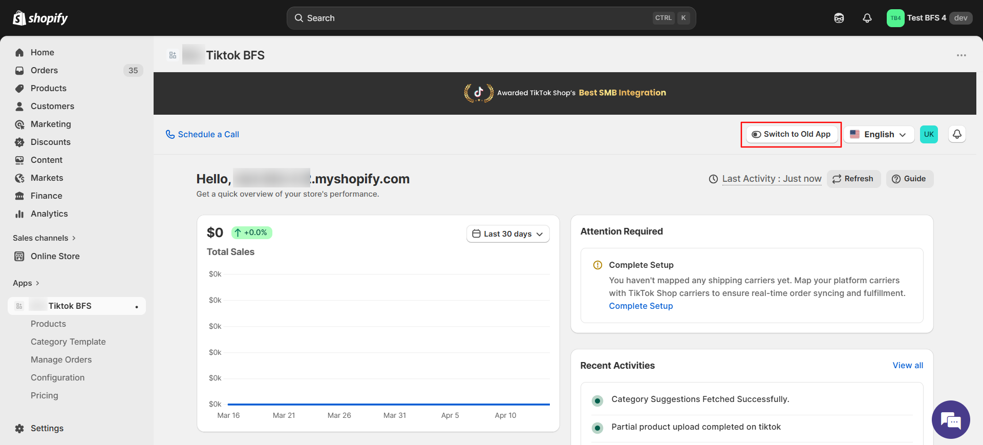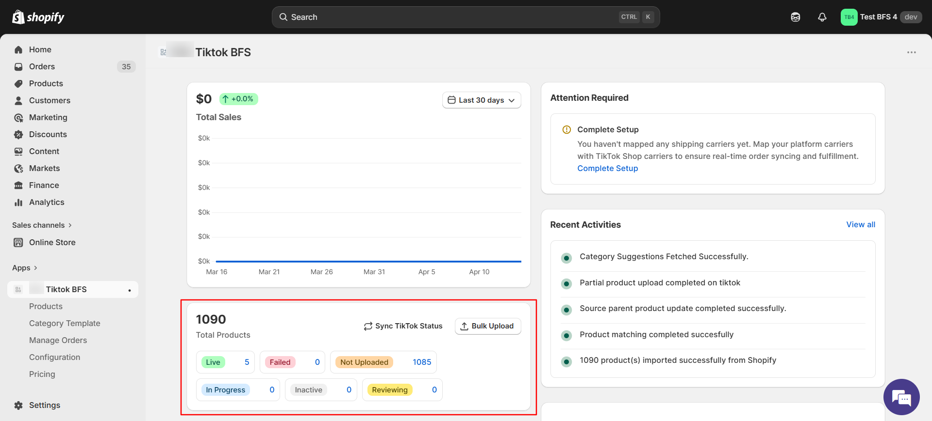The Dashboard gives you a quick snapshot of your TikTok Shop Connector account. From here, you can monitor store performance, track product and order status, view recent app activities, and identify setup tasks that still need attention.