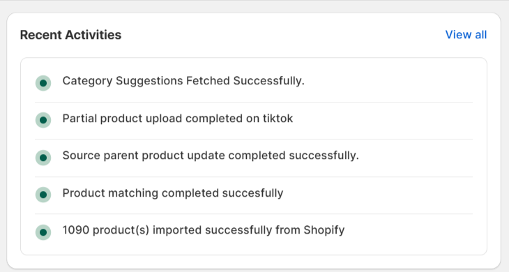 All the ongoing activities like product imports from Shopify, product uploads to TikTok Shop, automatic inventory updates, and completed activities are visible under this section. You can keep an eye on the activities from here and take timely actions as and when required.