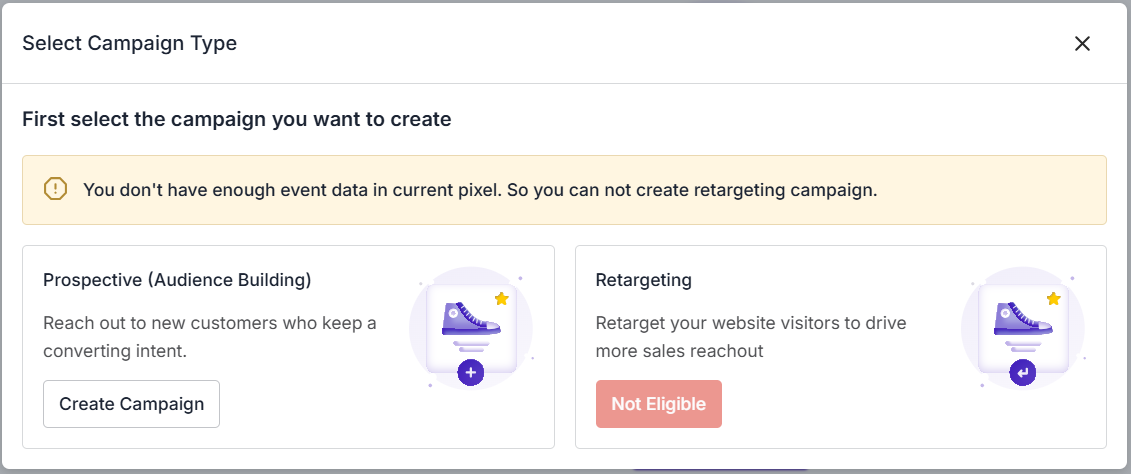 To run Retargeting campaigns, your Facebook Pixel must have sufficient data collected from website visitors. Without enough events, you will not be able to create a retargeting audience.
