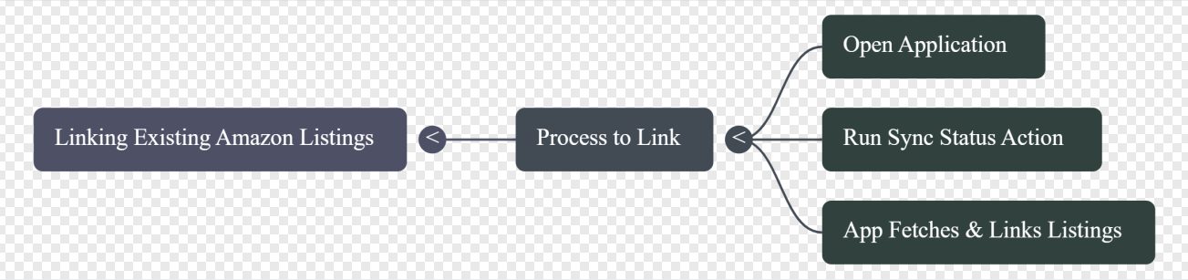 The "Sync Status" action instructs the app to fetch and link your existing product listings directly from Amazon.