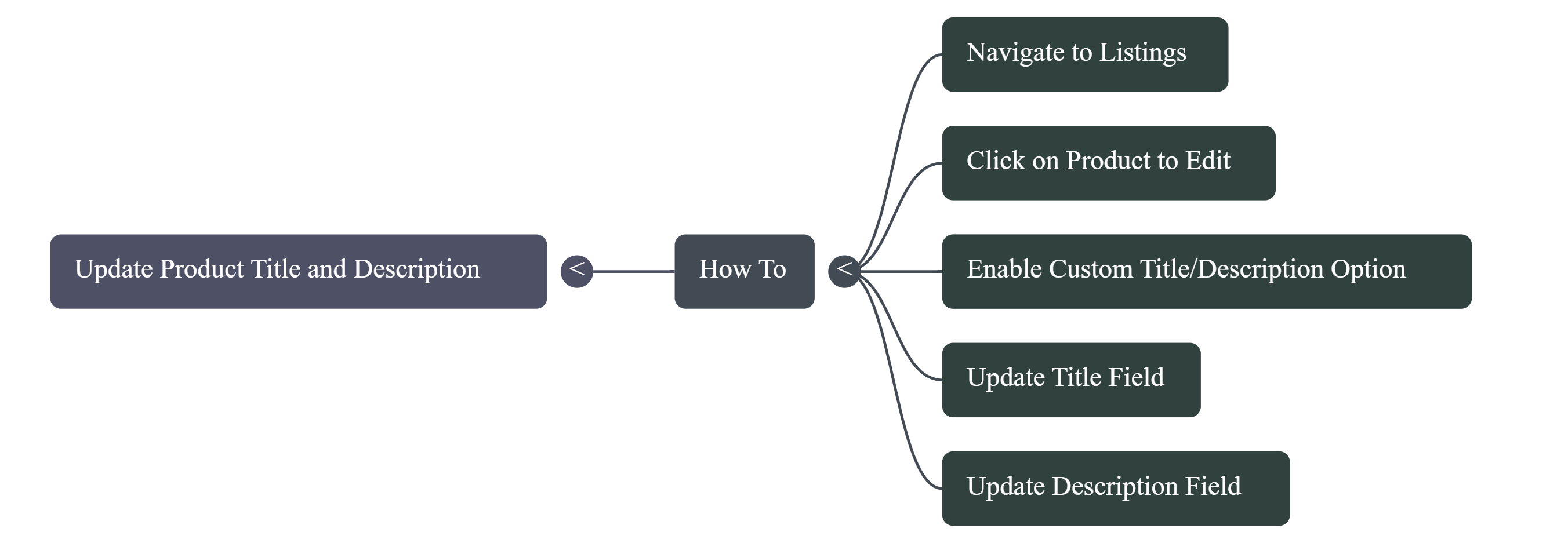 To update a product's title and description, you need to navigate to the Listings section. From there, click on the specific product you wish to modify. You'll then need to enable the option to set a custom title and description, which will allow you to update the respective Title and Description fields as needed.