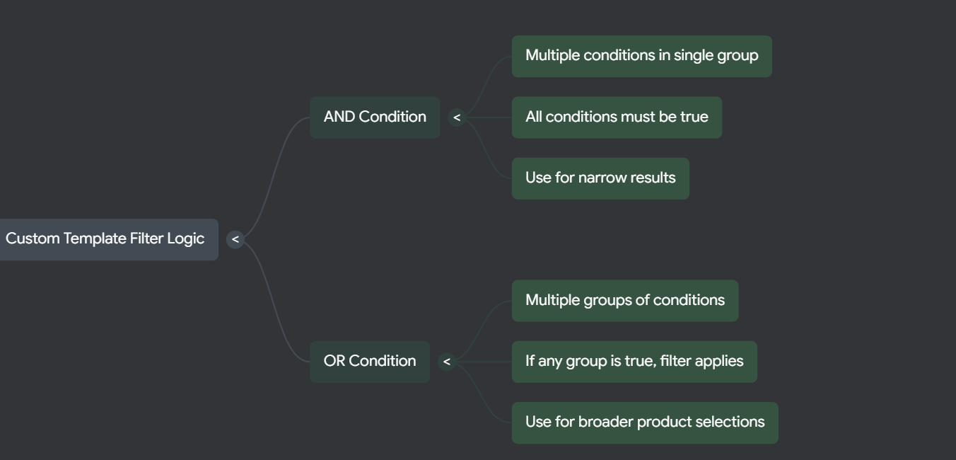 You should use the "AND" condition when you want to achieve narrow and specific results for your product selection. This is because all criteria you set must be met. On the other hand, you should use the "OR" condition when you are looking for broader product selections, as it applies the filter if at least one of your defined groups of conditions is true.