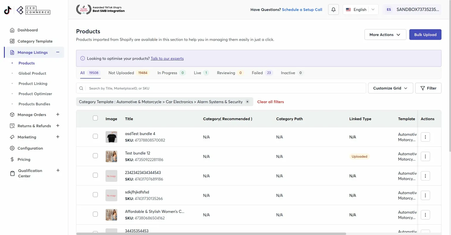 - You can manually upload or sync the products to TikTok Shop at any time from Manage Listings > Products. (See: Instructions to upload selected products on TikTok Shop)