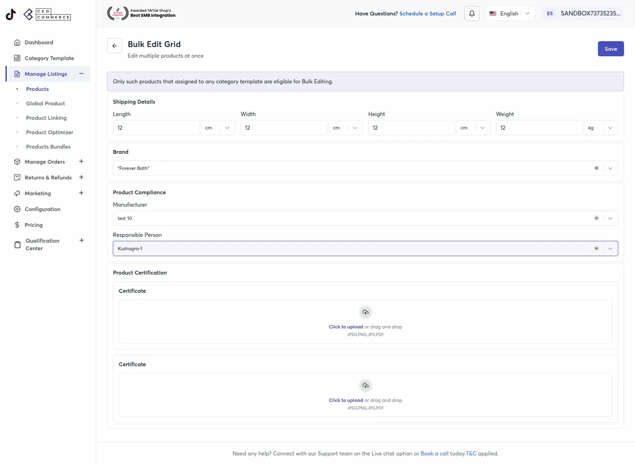 The Bulk Product Edit feature in TikTok Shop Connector by CedCommerce allows Shopify sellers to update multiple product attributes at once — including shipping details, brand, compliance information, and certifications.