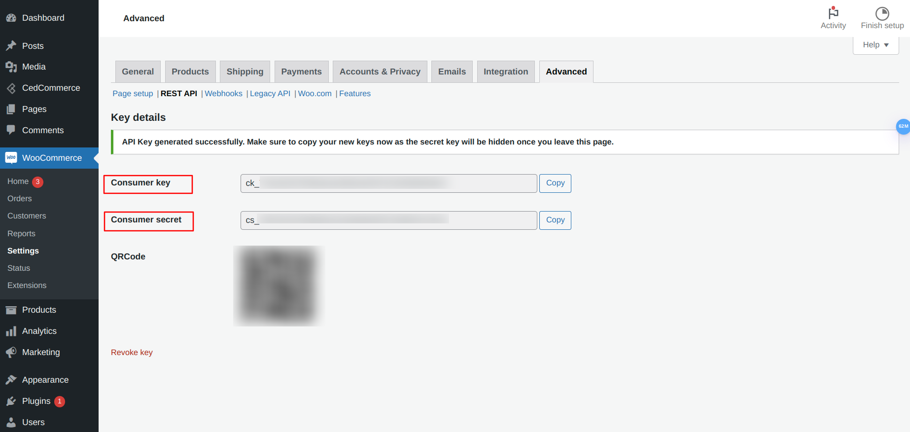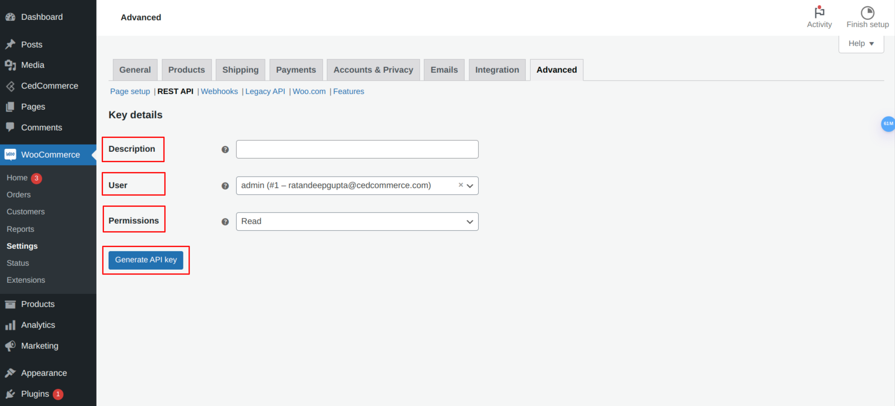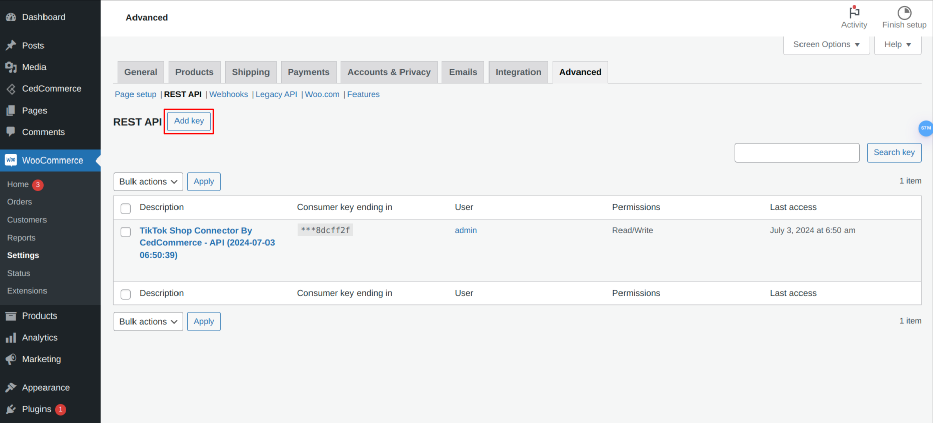 Navigate to the WooCommerce > Settings > Advanced > REST API.