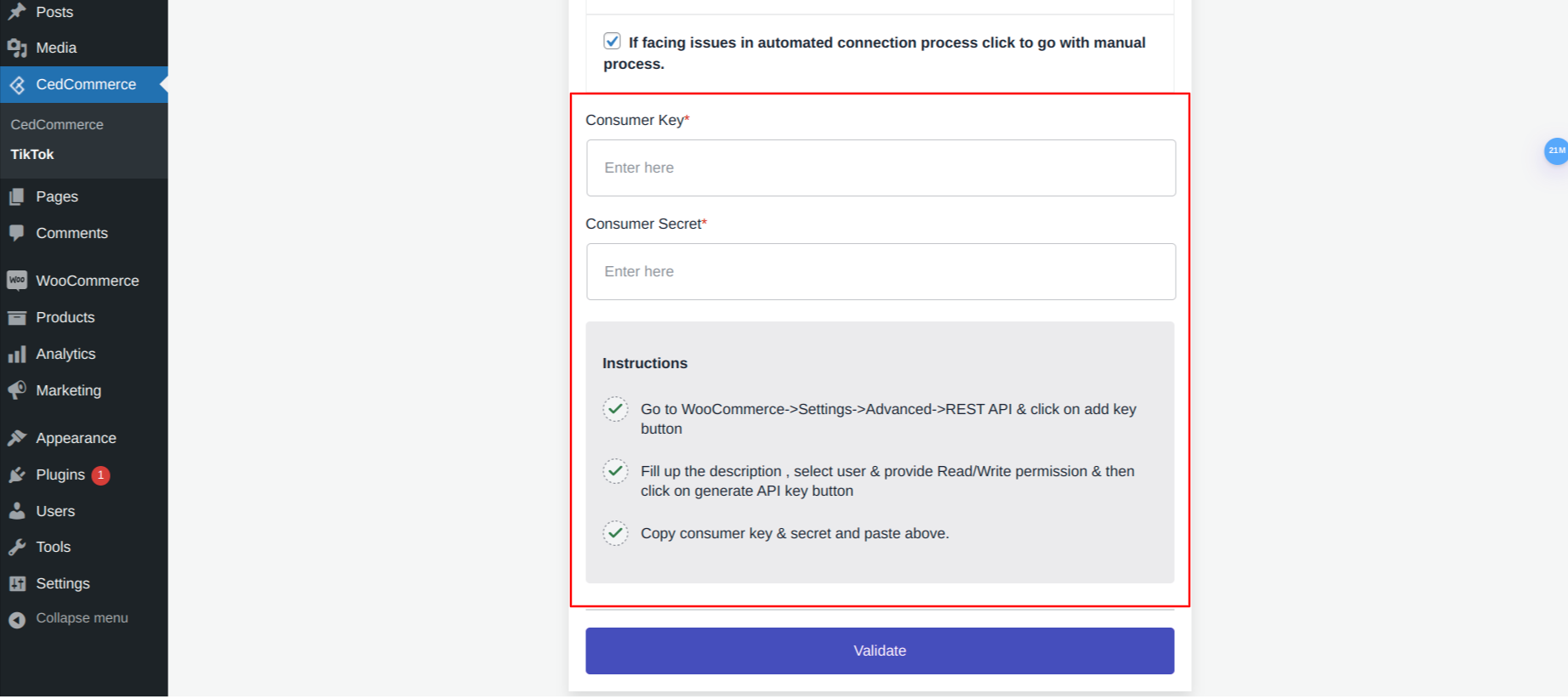After entering the Consumer Key and Consumer Secret, click the Validate button.