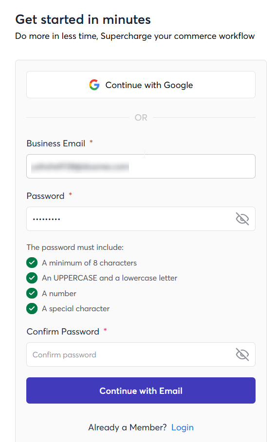 - To begin registration, sign up with Google or manually enter your email address, password, and confirmation password.