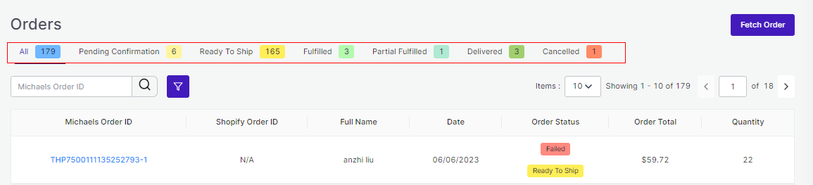 Order Tab helps you to fetch all your orders from Michaels to Shopify and get an overview of all the order details.