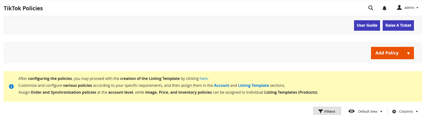 The TikTok Policies section allows you to create, manage, and assign all operational policies that control how your products, prices, inventory, orders, and synchronization behave between your Magento store and TikTok Shop.
