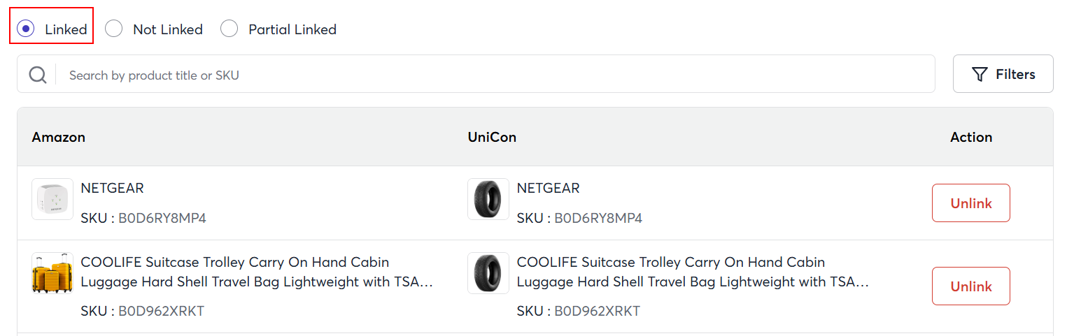 - Linked – Products that are successfully connected between UniCon and the marketplace.