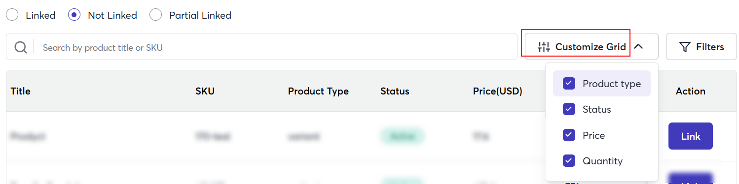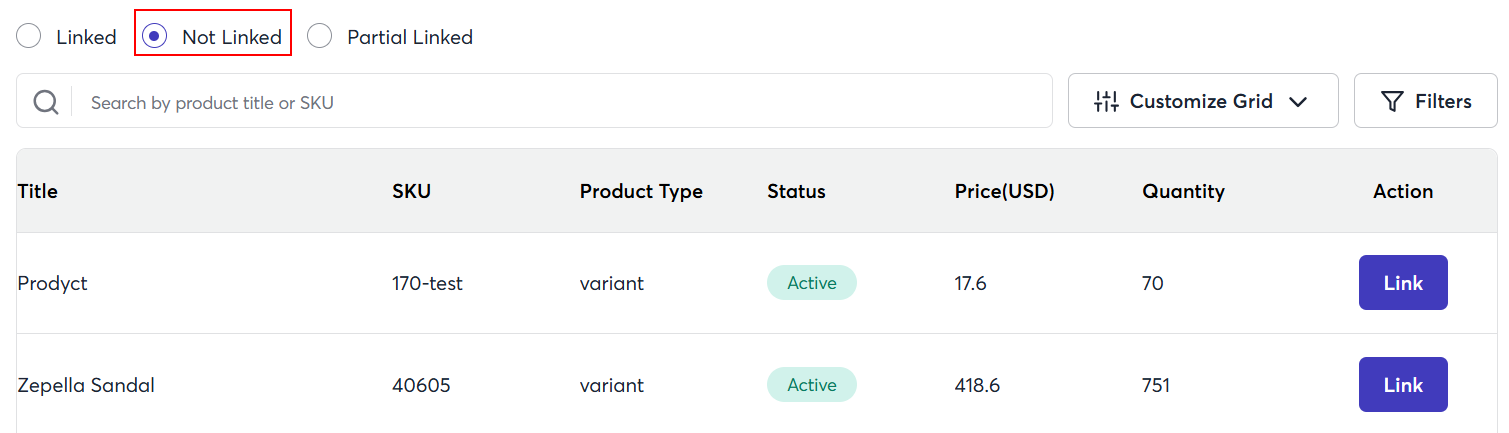 - Action: For not linked products, you’ll see a Link button. Clicking it creates a connection between the two records.