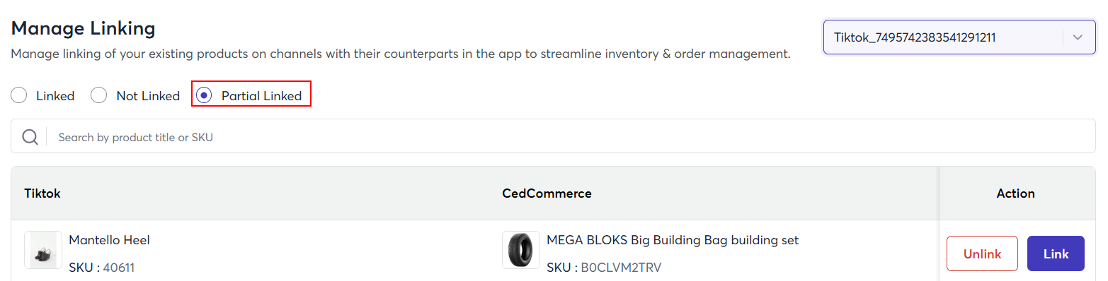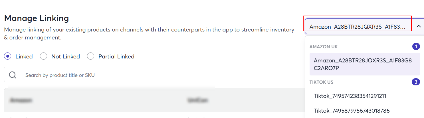 At the top, you’ll see a dropdown menu for each connected channel account (e.g., TikTok, Amazon). You can switch between accounts to manage product linking per channel.
