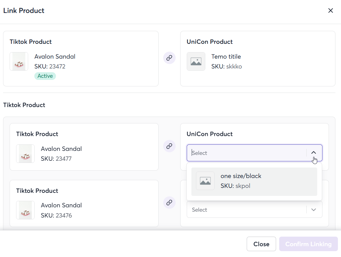 The Manage Linking section helps you connect your marketplace listings with their corresponding products in UniCon. This ensures smooth inventory synchronization, accurate order routing, and prevents issues like SKU duplication across channels such as TikTok Shop or Amazon.