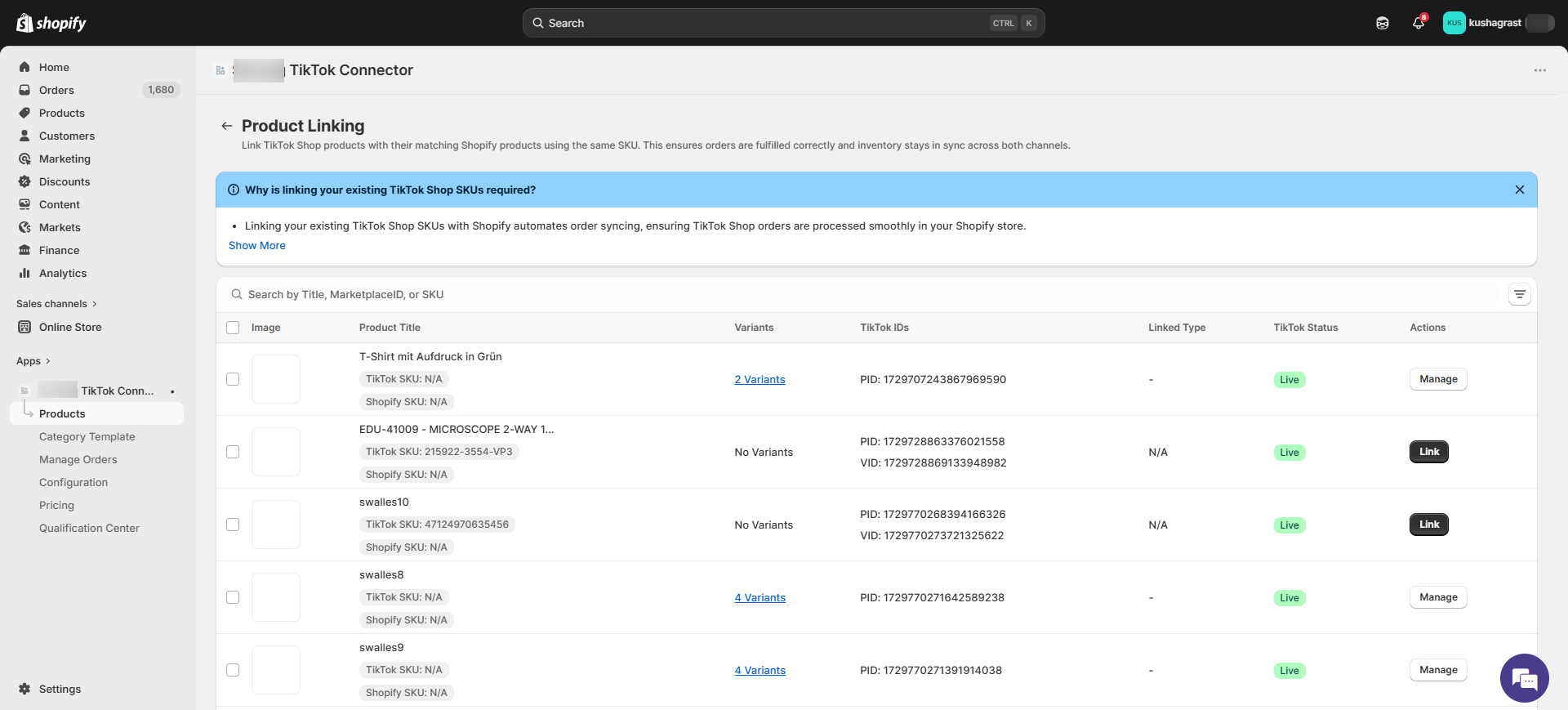 The Product Linking section of the app gives you an overview of all the products that are linked or are to be linked with TikTok Shop for easy fulfillment on your Shopify store. Linking is crucial to improve order and inventory syncing of the products. It also helps in preventing duplicate SKU listing on TikTok Shop.