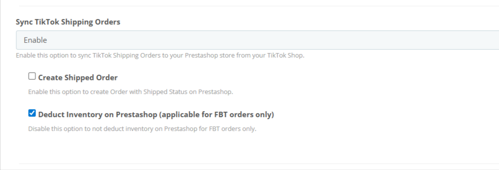 - Deduct Inventory on PrestaShop (FBT orders only): Enable this option to automatically deduct inventory for FBT orders in PrestaShop, so you can maintain accurate stock levels and prevent overselling.
