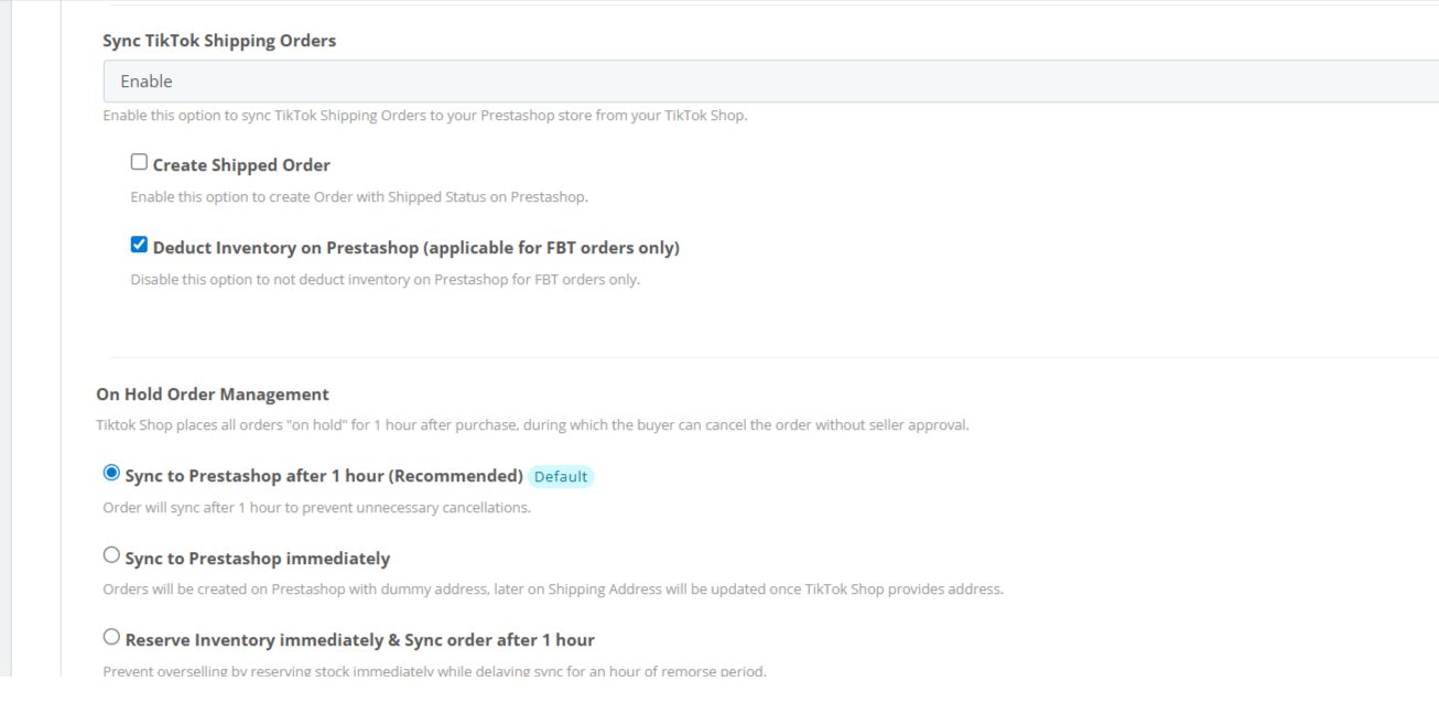 - Sync TikTok Shipping Orders: Enable this setting to automatically sync shipping orders from TikTok Shop to your PrestaShop store, so you can manage fulfillment in one place without manual updates.